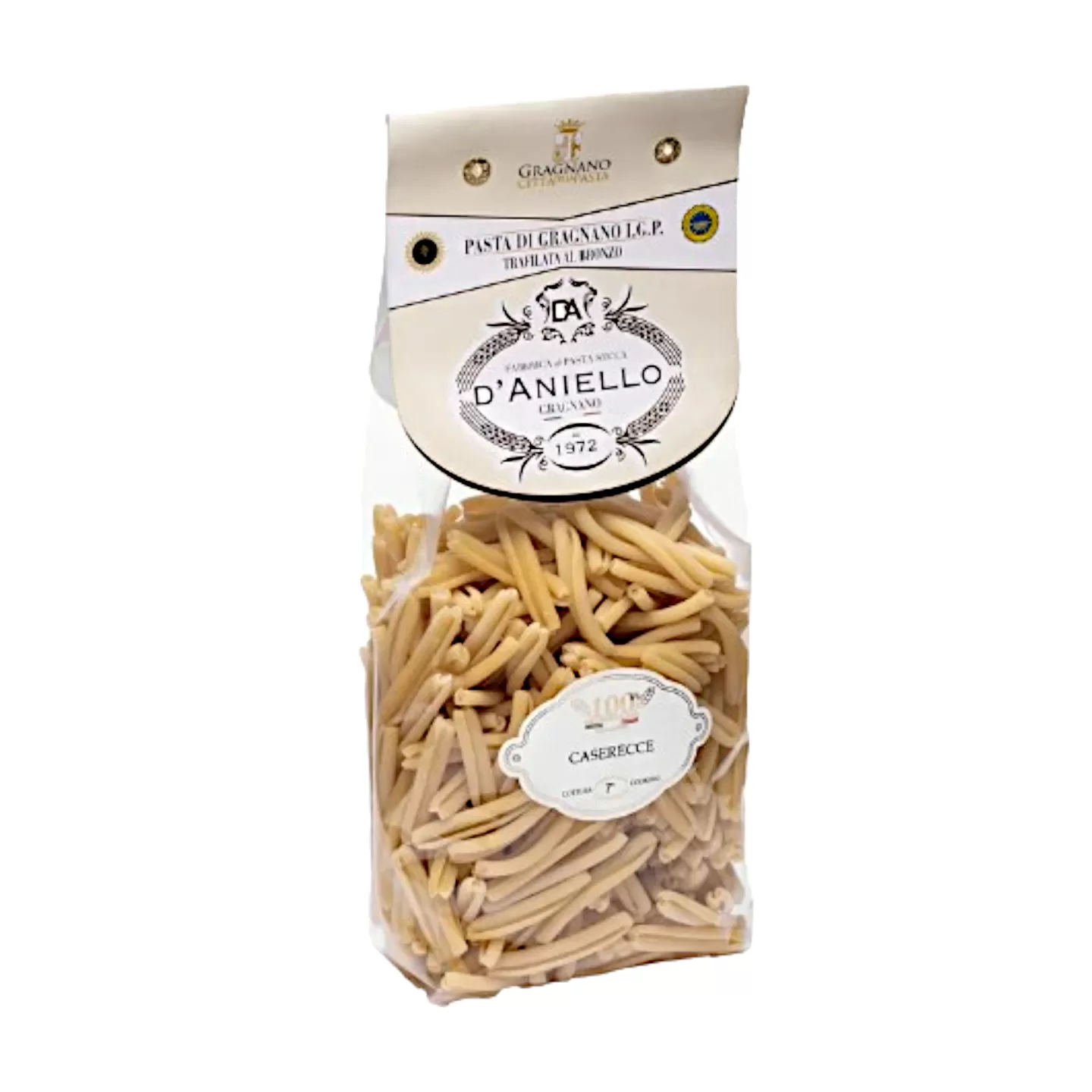 Die Caserecce, Pasta aus Gragnano IGP der Pastamanufaktur D'Aniello, werden aus einem Teig aus Hartweizengrieß und Wasser des lokalen Grundwassers hergestellt, Merkmale, die auch in der Spezifikation I.G.P. PASTA DI GRAGNANO festgelegt sind.