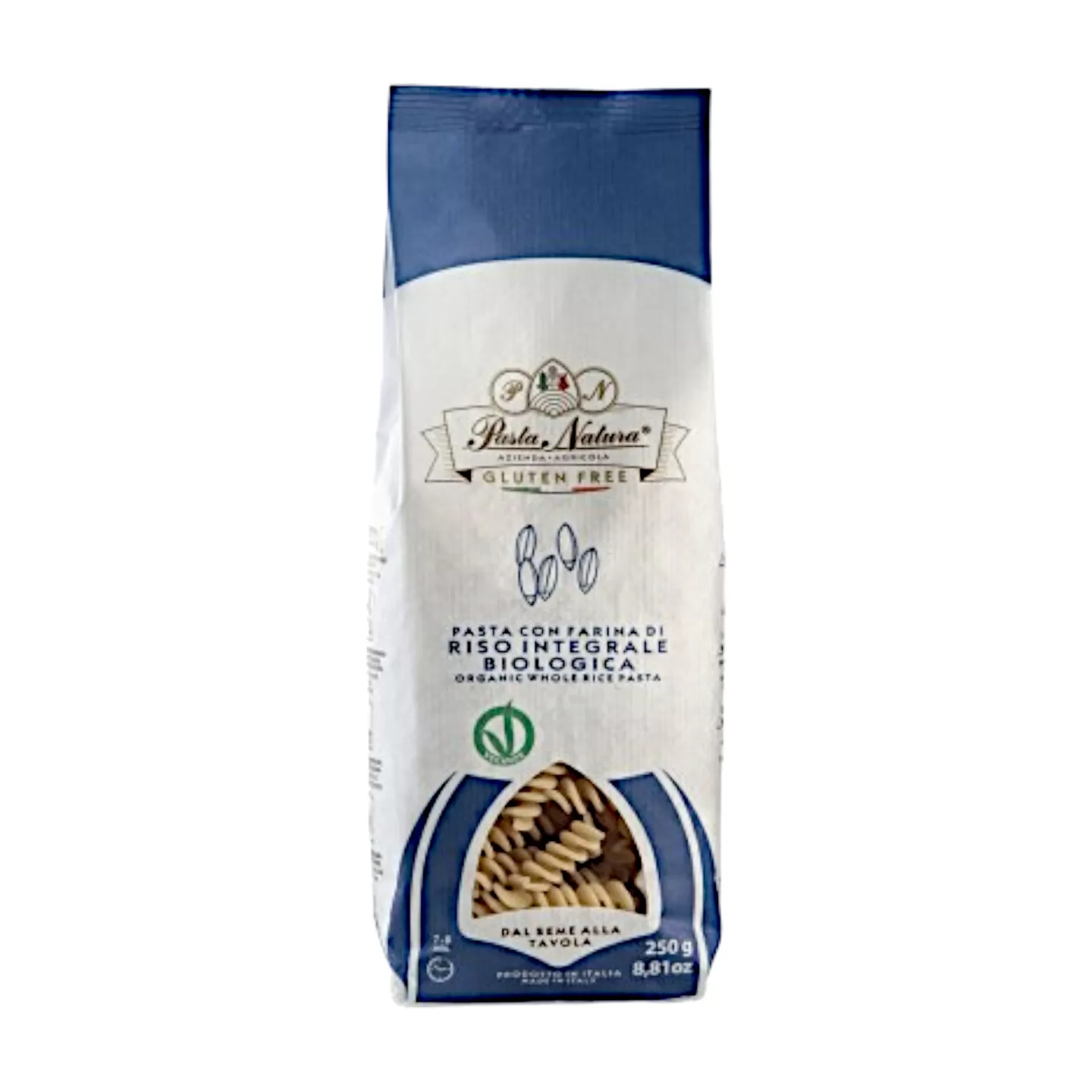 Vollkornreis enthält gute Nährstoffe wie Stärke, B- und E-Vitamine, Proteine und Mineralien (Kalzium, Eisen, Phosphor, Magnesium, Mangan, Kalium, Kupfer, Silizium und Natrium). Die Vollkornreismehl-Pasta ist auch in Bio-Qualität erhältlich, die all diese wunderbaren Eigenschaften bewahrt und keine Gesundheitsrisiken birgt, da der Reisanbau keine Pestizide verwendet: Der „Vollkorn“-Teil unseres Korns behält keine schädlichen Substanzen. Aus diesem Grund verwenden wir hauptsächlich Bio-Mehle aus unserem eigenen landwirtschaftlichen Betrieb: Wir möchten ausschließlich gute, gesunde und sichere Produkte anbieten. Reis ist sehr verdaulich und besonders geeignet für Menschen mit Bluthochdruck und Verstopfung. Vollkornreismehl ist von Natur aus glutenfrei, die Vollkornreismehl-Pasta von PASTA NATURA ist geeignet für Menschen mit Zöliakie, wie durch das durchgestrichene Ährensymbol auf der Verpackung zertifiziert.