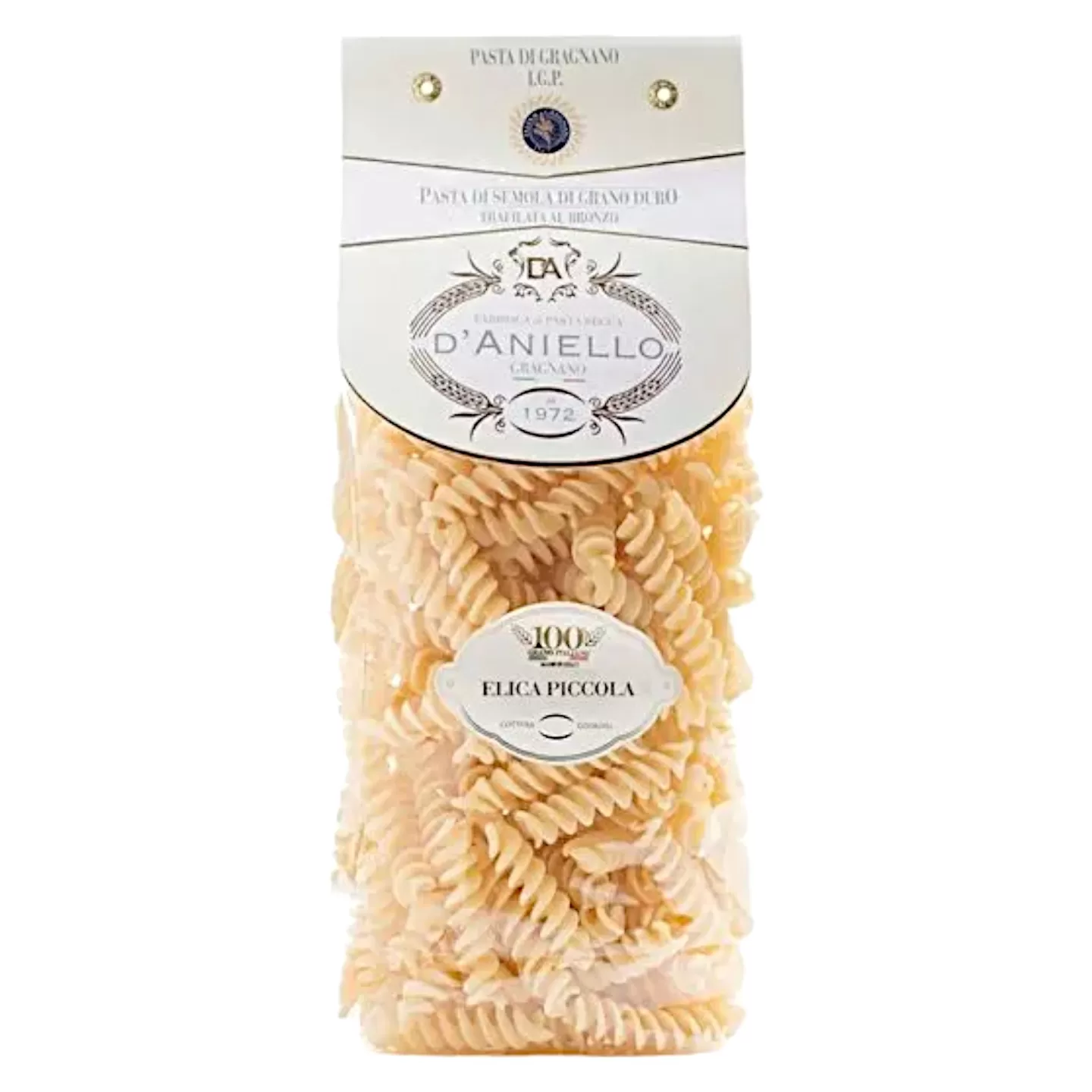 Die kleinen Eliche-Nudeln von Gragnano IGP D'Aniello werden aus einem Teig aus Hartweizengrieß und Wasser aus dem örtlichen Grundwasser hergestellt, Merkmale, die auch in der Spezifikation I.G.P. PASTA DI GRAGNANO festgelegt sind.