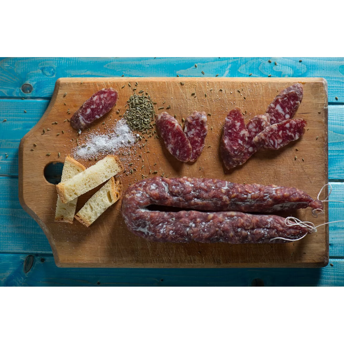 Halbscharf mit Messerspitze: Schweinefleisch (mit dem Messer geschnitten), Salz und Gewürze, Paprikapulver und Fenchel.