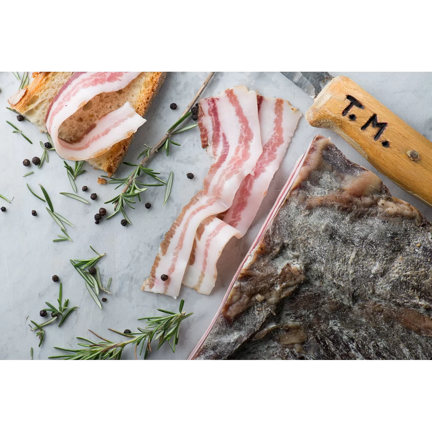 Die flache Pancetta von Salumificio Tornillo wird ohne zugesetzte Konservierungsstoffe hergestellt, manuell verarbeitet mit Fleisch ausschließlich von einheimischen Schweinen, die mit natürlichen Futtermitteln aufgezogen und nicht intensiv gemästet werden.