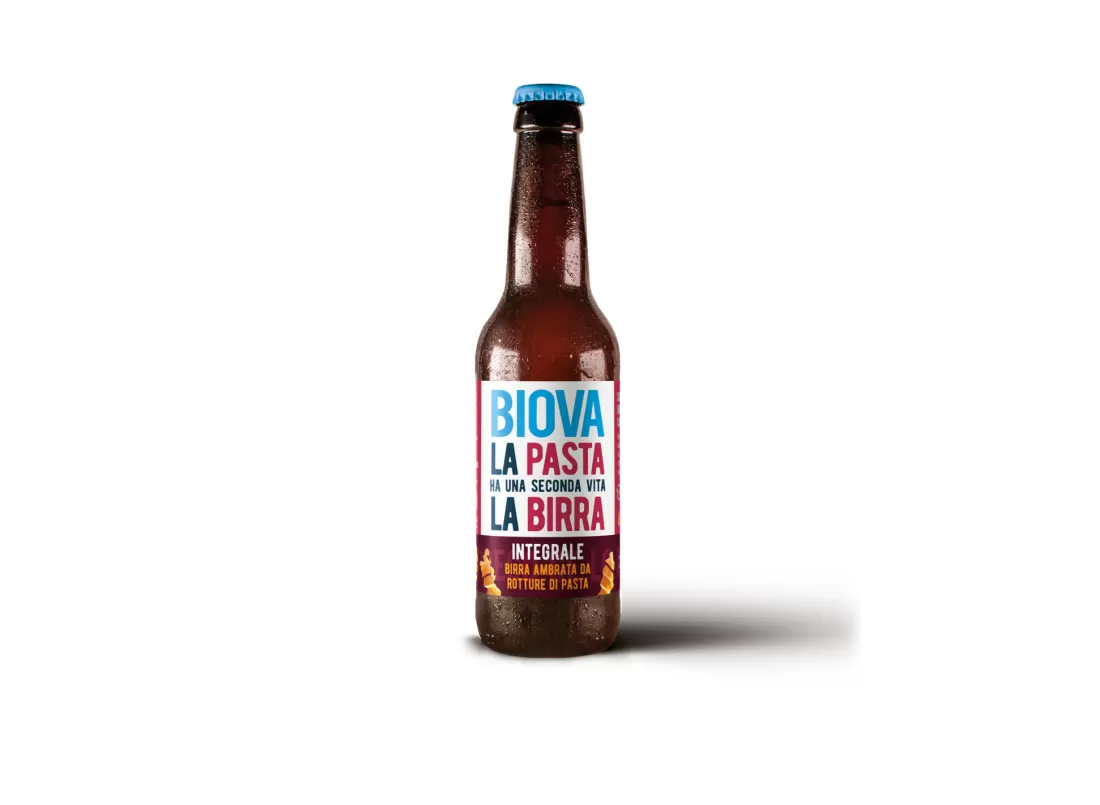 Entdecken Sie das Integrale Bier Surplus Pasta von Biova Project, ein einzigartiges Craft-Bier, das mit dem Nudelüberschuss der Pasta Berruto Fabrik hergestellt wird.