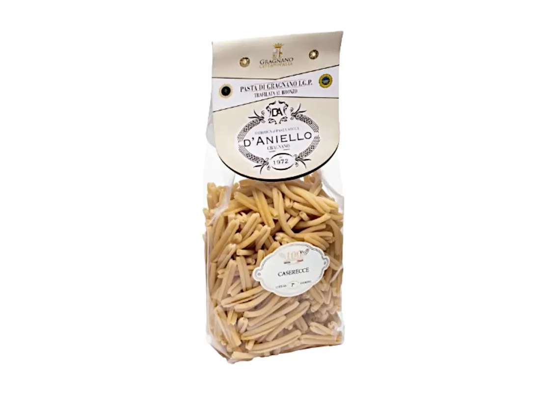 Die Caserecce, Pasta aus Gragnano IGP der Pastamanufaktur D'Aniello, werden aus einem Teig aus Hartweizengrieß und Wasser des lokalen Grundwassers hergestellt, Merkmale, die auch in der Spezifikation I.G.P. PASTA DI GRAGNANO festgelegt sind.