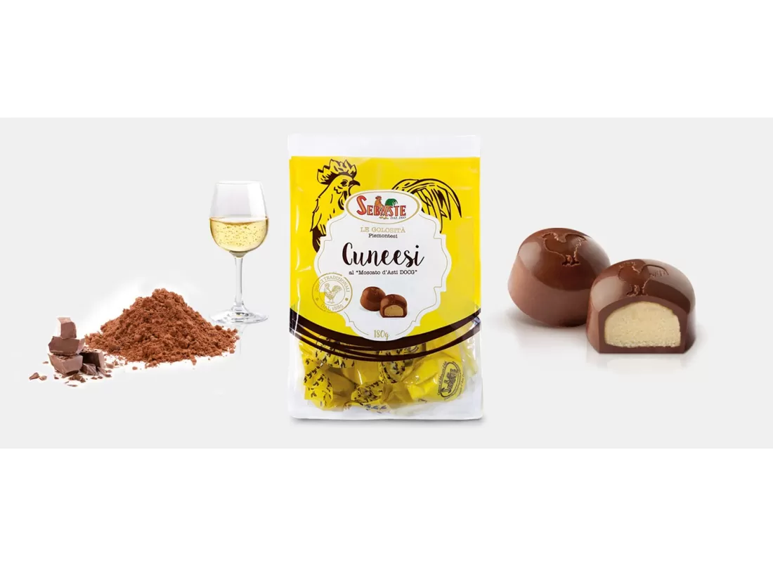 Äußere Zutaten: Milchschokoladenüberzug 44% (Zucker, Kakaobutter, Vollmilchpulver, Kakaomasse. Emulgator: Sojalecithin. Natürliches Vanillearoma. Kakao min 33%). Füllungszutaten: Weiße Schokolade (Zucker, Vollmilchpulver, Kakaobutter. Emulgator: Sojalecithin. Natürliches Vanillearoma. Kakao min 22%), teilweise entrahmte Milch, alkoholisches Moscato-Aroma 4%, Moscato D’Asti DOCG 3%, Dextrose, Zucker, Eier, Weizenmehl, Invertzucker. Aromen. Kann Spuren von Haselnüssen, Pistazien, Mandeln, Sesam, Sulfite enthalten. Enthält Gluten.