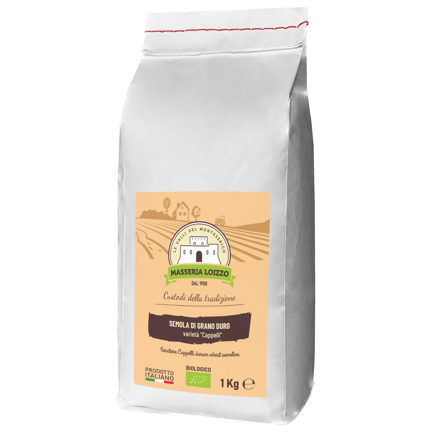 Senatore Cappelli durum wheat semolina (Masseria Loizzo) is exclusively obtained from the heart of the grain, giving it a particularly granular texture similar to sand. Thanks to the presence of carotenoids and antioxidants, it boasts a typical intense yellow coloration. Additionally, this flour is suitable for those following a vegetarian or vegan diet, as it contains a large amount of protein and gluten. Durum wheat semolina is ideal for preparing pasta with authentic flavor and perfect cooking, as it retains starch within.