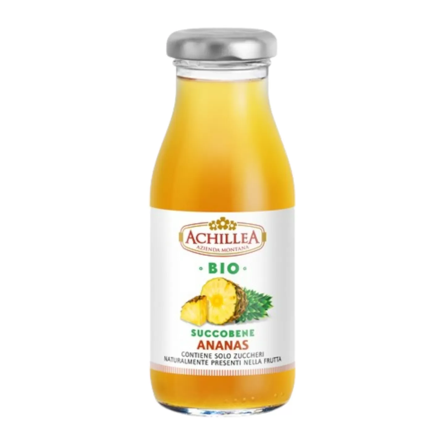 Discover Achillea's 100% Organic Pineapple Juice, a healthy and refreshing beverage. This 200 ml juice is prepared with only pineapples from organic farming, ensuring the highest quality and environmental respect. Perfect for those seeking a natural and tasty drink without added sugars.