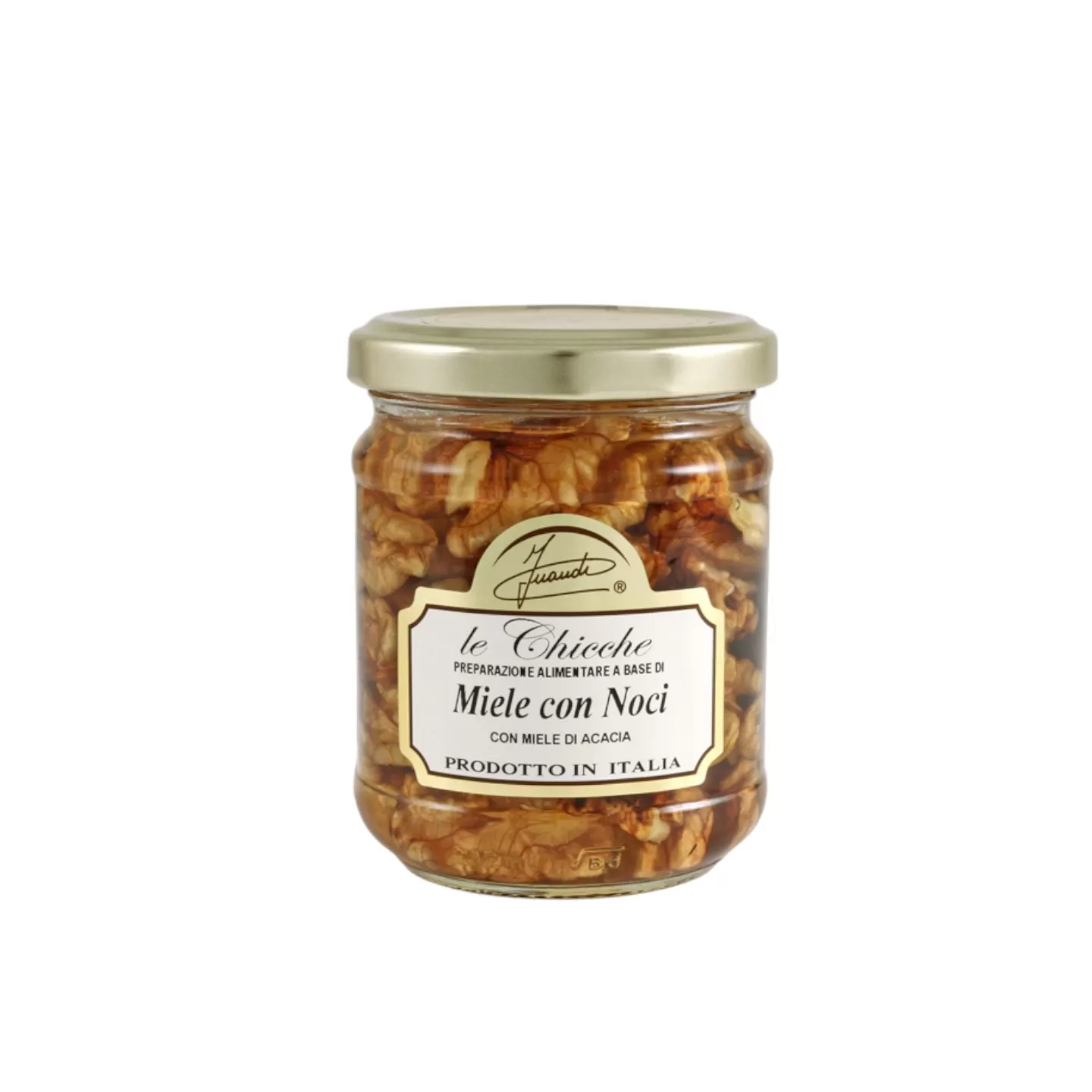Inaudi's acacia honey with walnuts is a high-quality product that combines the delicacy of acacia honey with the crunchiness of selected walnuts. This honey is perfect for pairing with cheese, ice cream, or as an ingredient in sweets and desserts. Made with natural ingredients and gluten-free, it offers a unique tasting experience. The artisanal processing ensures a genuine and flavorful product. After opening, store in a cool place away from direct light to maintain its freshness.