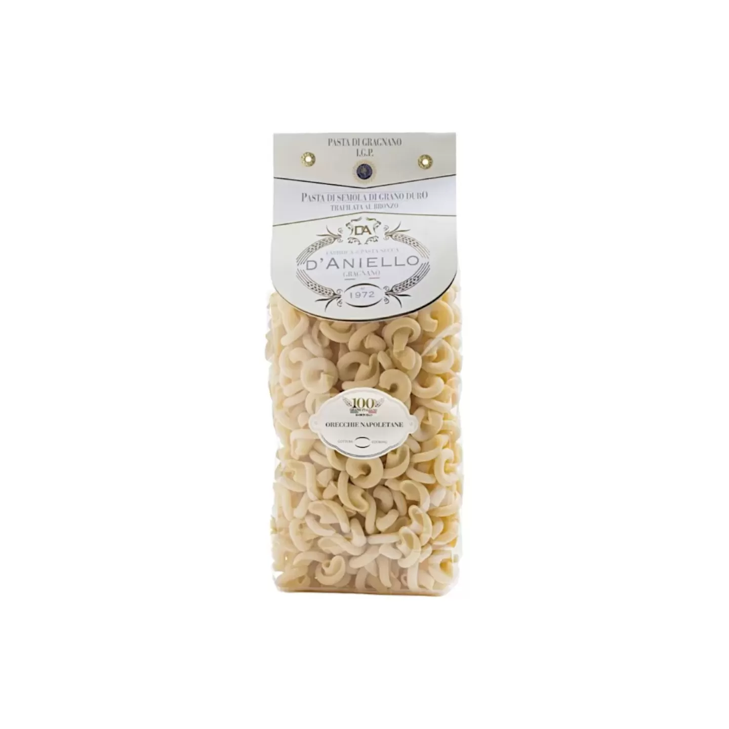 The Neapolitan Orecchiette di Gragnano IGP D'Aniello are obtained from the mixture of durum wheat semolina with water from the local aquifer, characteristics also specified in the I.G.P. PASTA OF GRAGNANO.