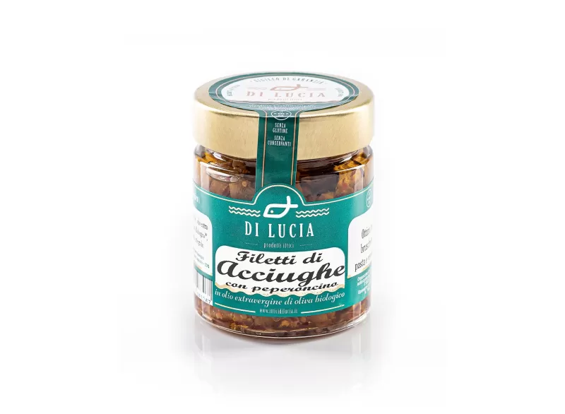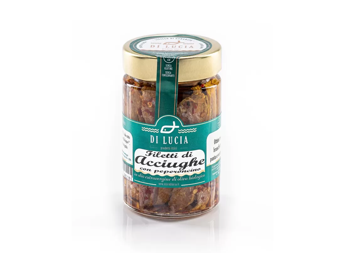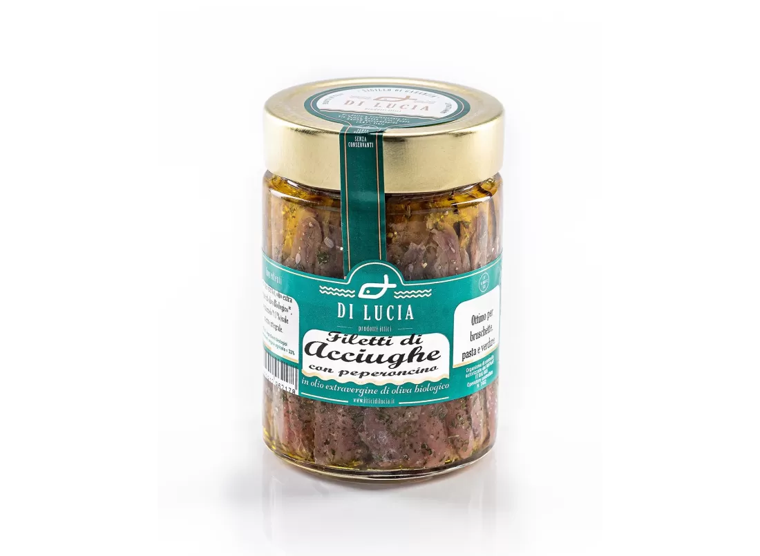 Discover the Organic Anchovy Fillets with Chili in EVO Oil by Ittici Di Lucia, preserved in extra virgin olive oil and chili to ensure the highest quality and flavor.