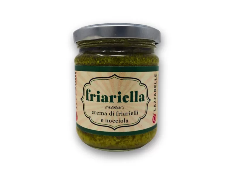 Friariella is a cream made from rapini and hazelnuts, produced by Masseria Antonio Esposito Ferraioli, a property confiscated from the Camorra. It is located in Afragola, on the outskirts of Naples, and covers over 120,000 square meters, hosting more than 300 urban gardens, an orchard with 3,000 trees, and a forest of 1,000 trees. The confiscated property also includes an agricultural Masseria, which is currently undergoing a redevelopment project with funds from the PON Legalità program. Upon completion of the work, a shelter for women victims of violence will be established here. This condiment is made from a typical and delicious ingredient of Neapolitan cuisine, can be used to season pasta, rice, or served as a side dish for meats or fish. Its creamy texture and the distinctive flavor of rapini can add a touch of Mediterranean and slightly bitter taste to various dishes, while thanks to the presence of hazelnuts, the cream acquires a rich and buttery flavor typical of hazelnuts