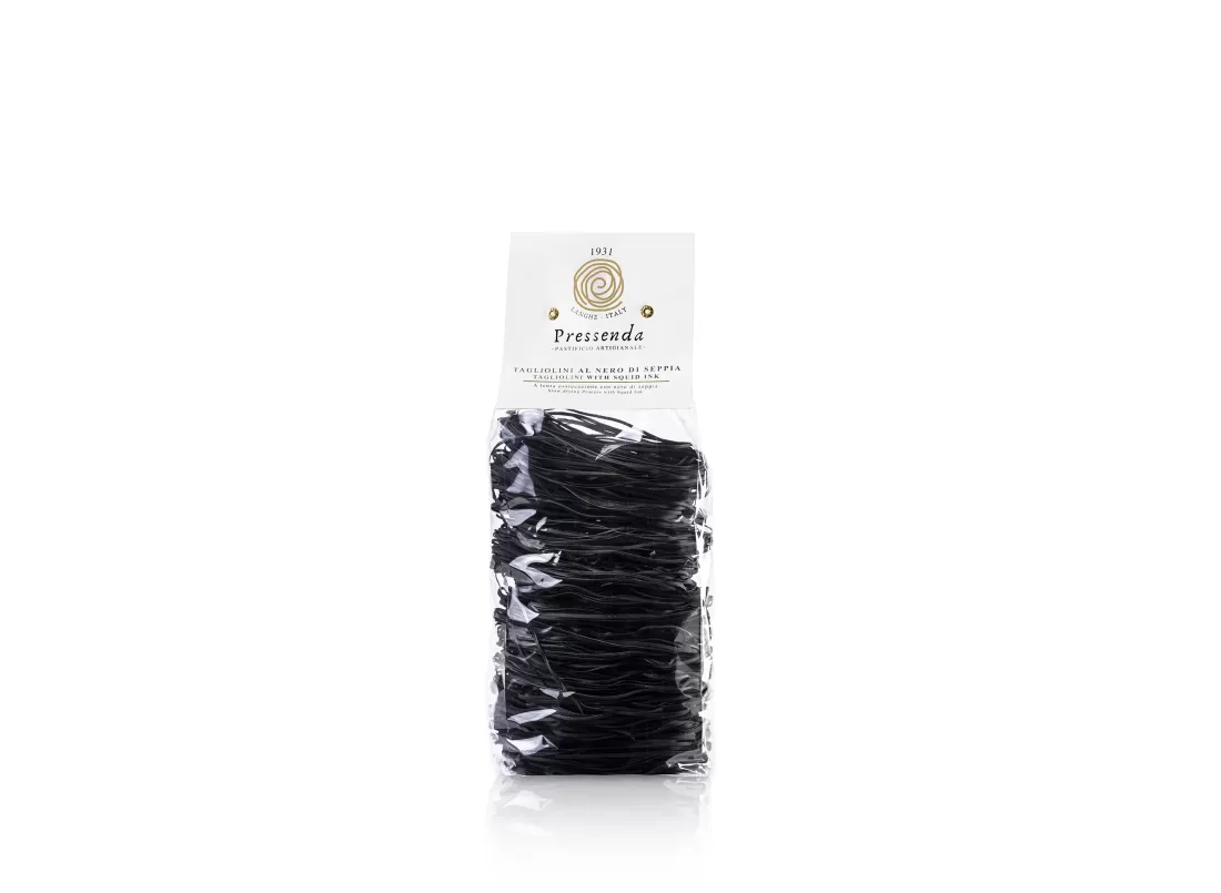 Discover Pastificio Pressenda's Squid Ink Tagliolini, an artisanal pasta that blends Italian tradition with the unique flavor of squid ink. Perfect for those seeking a sophisticated and intense culinary experience, these tagliolini are ideal for seafood dishes, adding a touch of elegance and refinement.