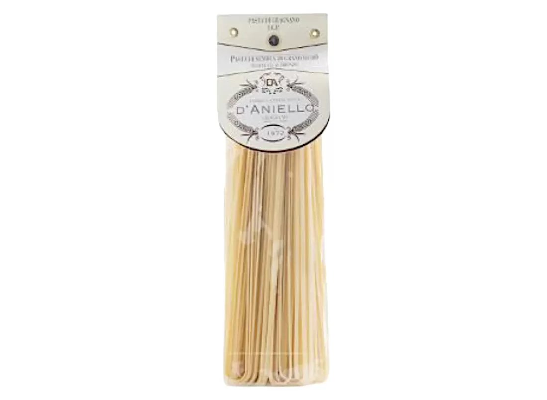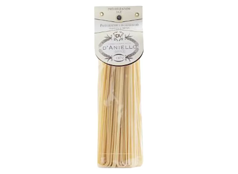 Linguine, Gragnano IGP pasta from the D'Aniello pasta factory, are made from a mixture of durum wheat semolina and water from the local water table, features also set out in the I.G.P. PASTA DI GRAGNANO specification.