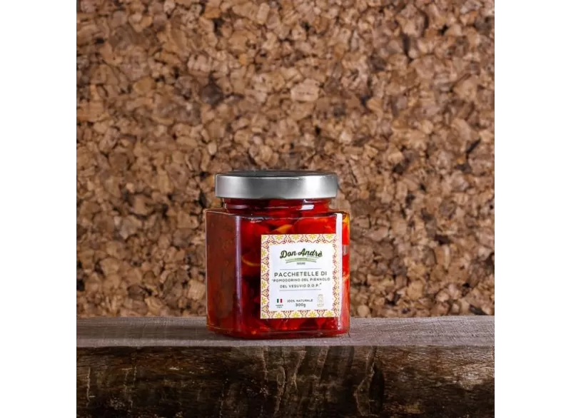 Pacchetelle of "Pomodorino del Piennolo del Vesuvio D.O.P.". Don Andrè, tomatoes picked when fully ripe, carefully selected by hand.