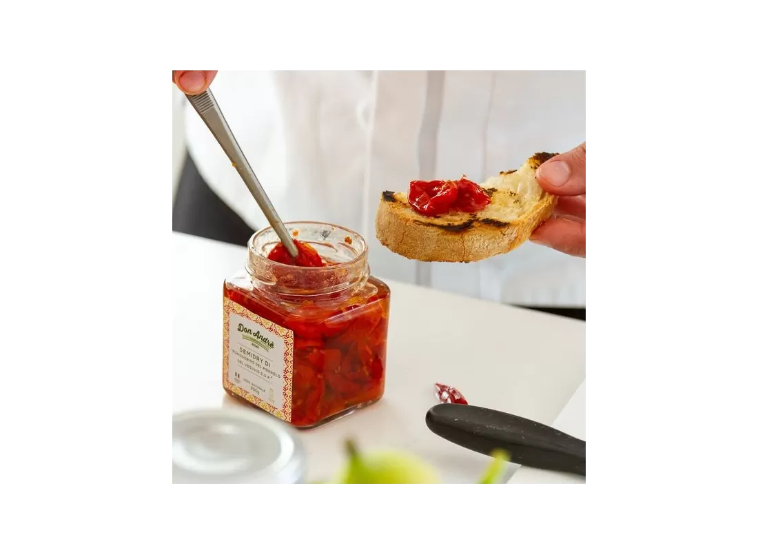Don Andre's Semidry Pomodorino del Piennolo del Vesuvio D.O.P. is an exceptional product. Grown in the fertile volcanic soils of Vesuvius, this tomato is renowned for its rich and aromatic taste. It's perfect for a wide range of recipes, from main courses to side dishes, always delivering a burst of flavor. Don Andre' stands out for its commitment to quality, producing excellence that respects Italian agricultural traditions.