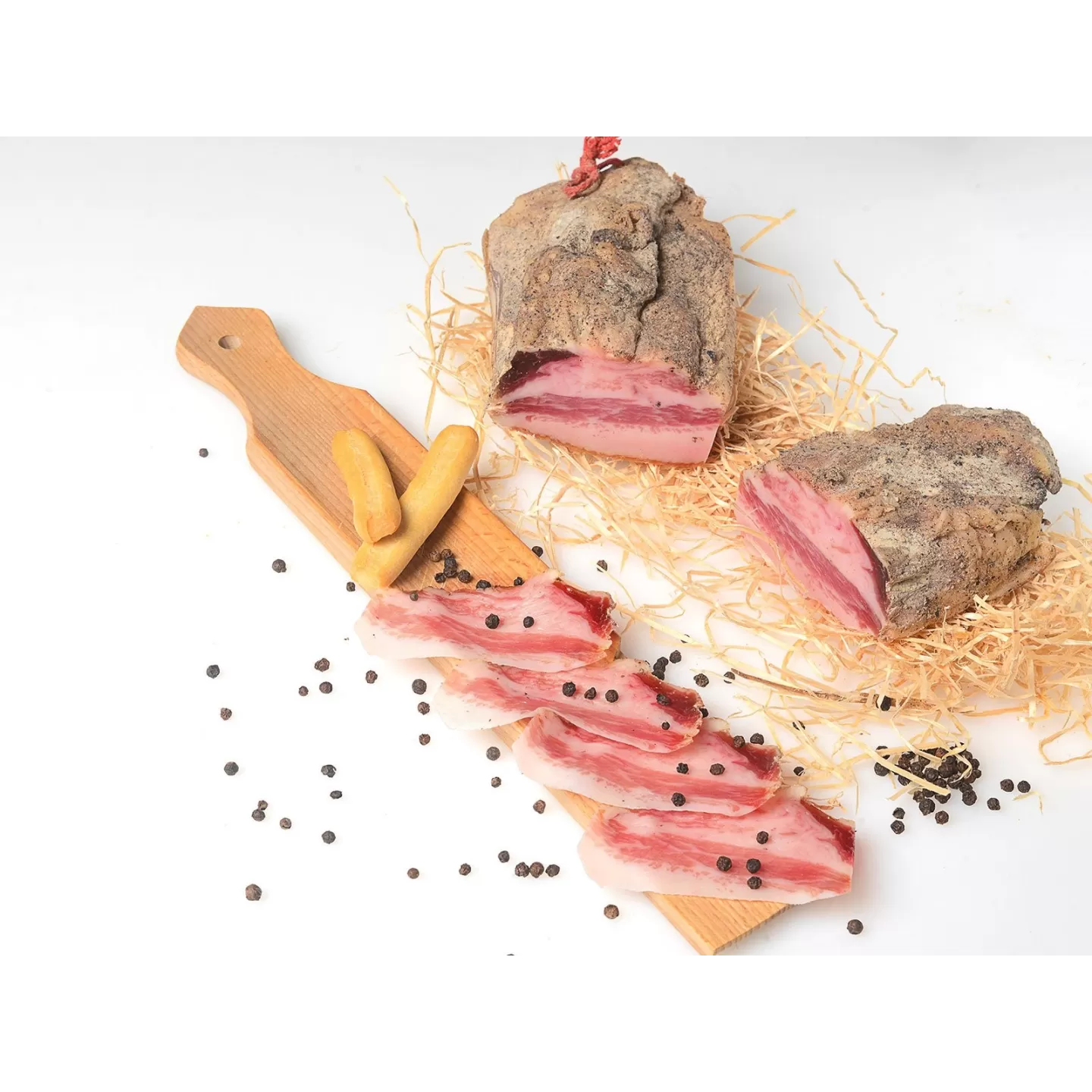 Le guanciale de la Salumeria Tornillo est produit sans conservateurs ajoutés, il est travaillé manuellement avec des viandes provenant exclusivement de porcs autochtones, élevés avec des aliments naturels et non élevés de manière intensive.