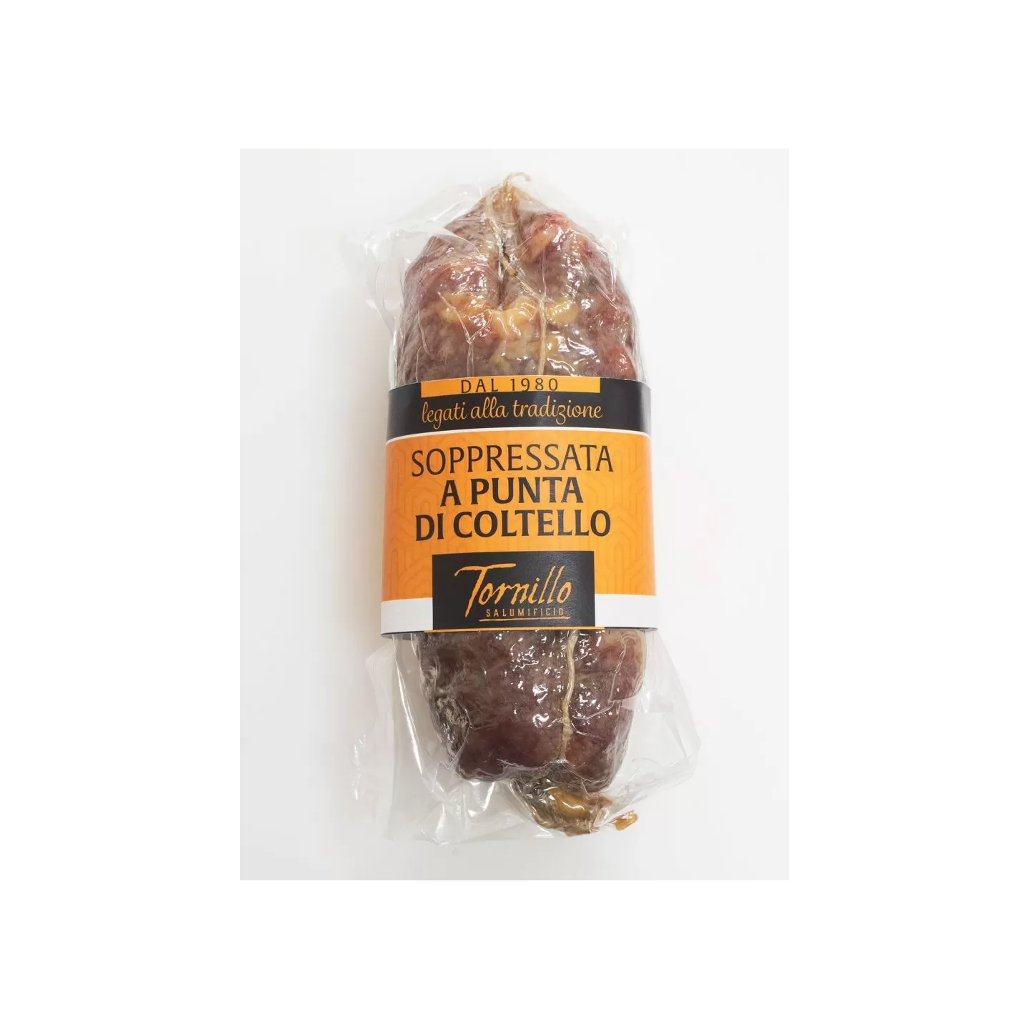 La Soppressata à la pointe de couteau du Salumificio Tornillo est produite sans conservateurs ajoutés, elle est travaillée manuellement avec des viandes provenant exclusivement de porcs autochtones, élevés avec des aliments naturels et non élevés de manière intensive.