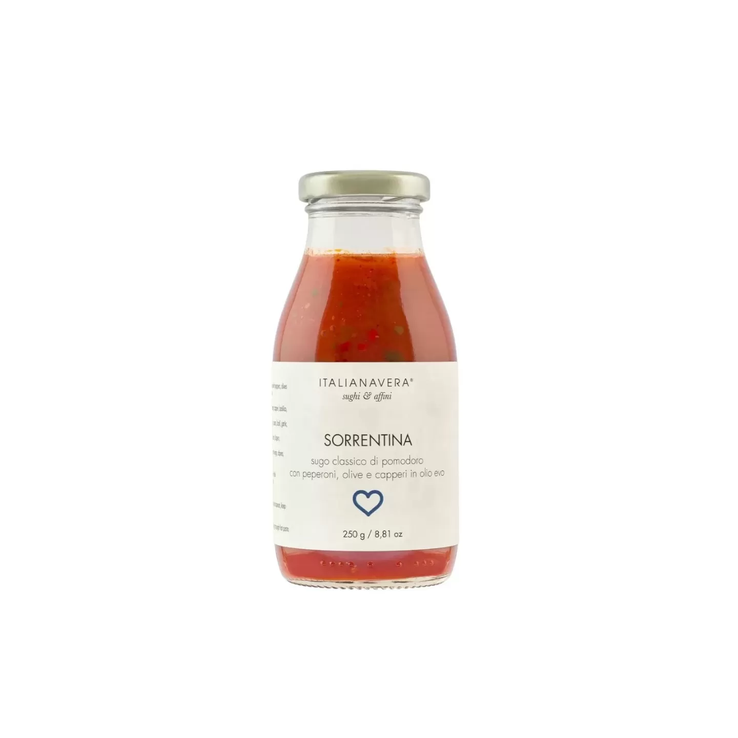 La sauce Sorrentina de Italiana Vera est préparée avec des tomates italiennes (87,66%), des poivrons (4,17%), des olives noires (3,67%), des câpres (1,34%) et aromatisée avec de l'huile d'olive extra-vierge, du basilic, de l'ail et de l'oignon. Cette sauce prête à l'emploi est idéale pour assaisonner les pâtes, les pizzas et les plats de viande, en ajoutant une saveur riche et authentique. Emballée dans des bouteilles pratiques de 250 g, elle est parfaite pour une utilisation immédiate et pour conserver la fraîcheur des ingrédients. Italiana Vera est synonyme de qualité et de passion pour la cuisine italienne.
