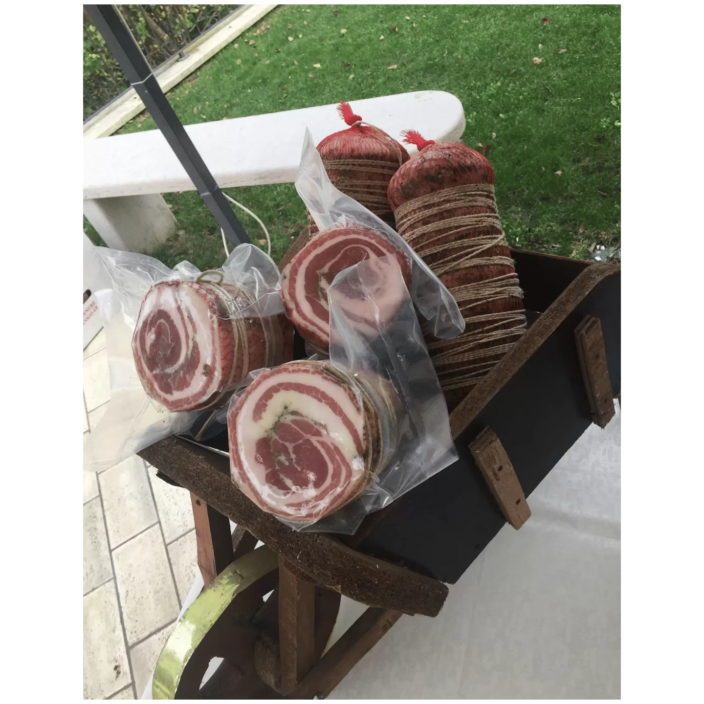 Questo prodotto si ottiene dalla pancetta di suino, accuratamente arrotolata e arricchita con una selezione di sale, aromi e spezie scelte.
