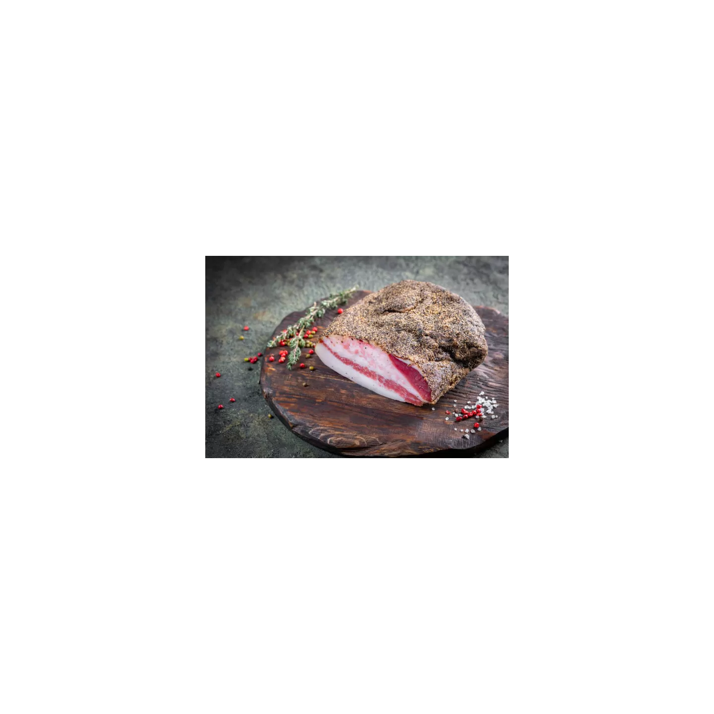 Il guanciale è un tesoro della salumeria italiana, noto per la sua texture unica e il sapore dolce e delicato. Rifilato a goccia e stagionato con cura, si distingue per la sua versatilità sia con pepe che peperoncino.