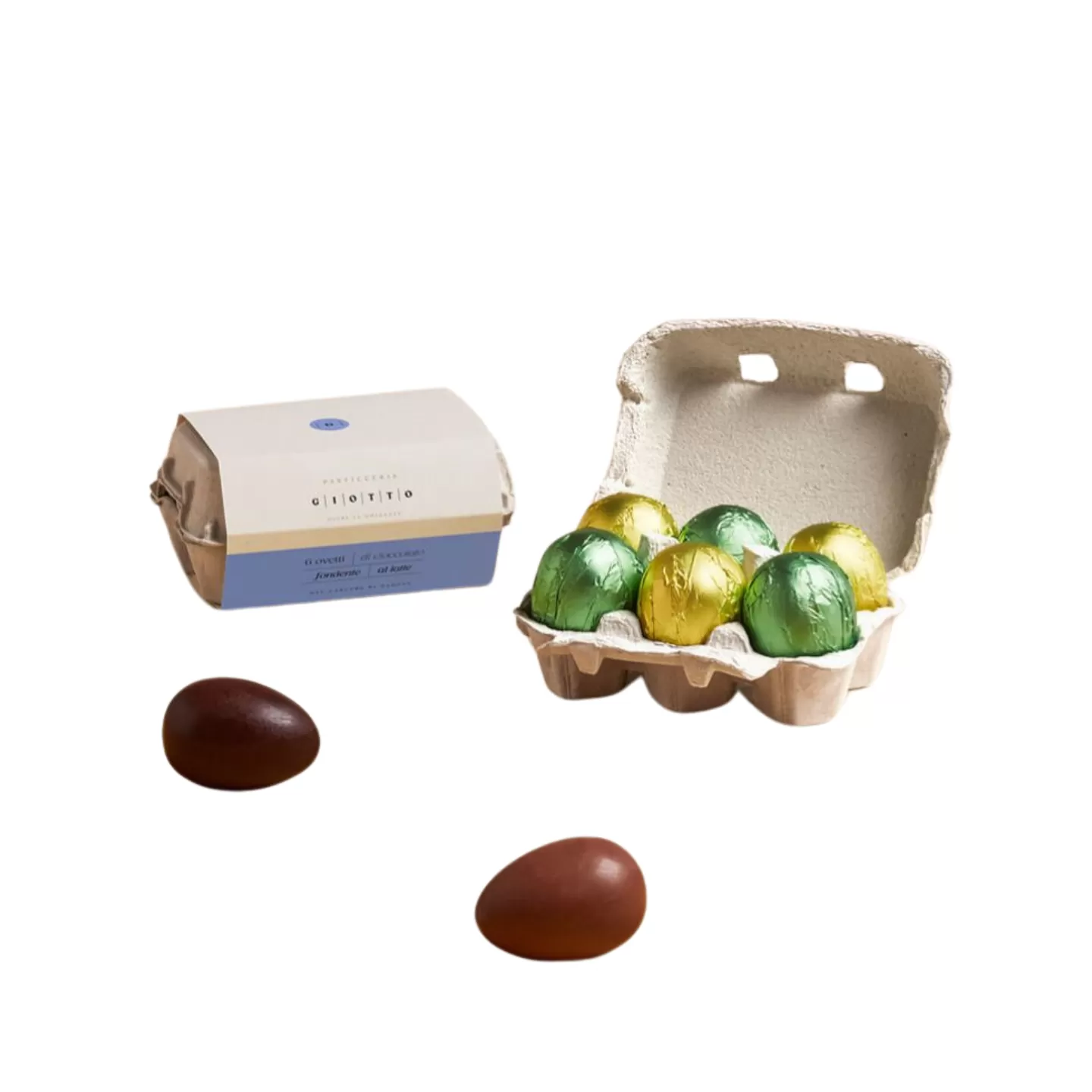 Deliziosi ovetti di cioccolato, perfetti per soddisfare la golosità senza sensi di colpa: tre al cioccolato al latte e tre fondenti, per un totale di sei piccole tentazioni.