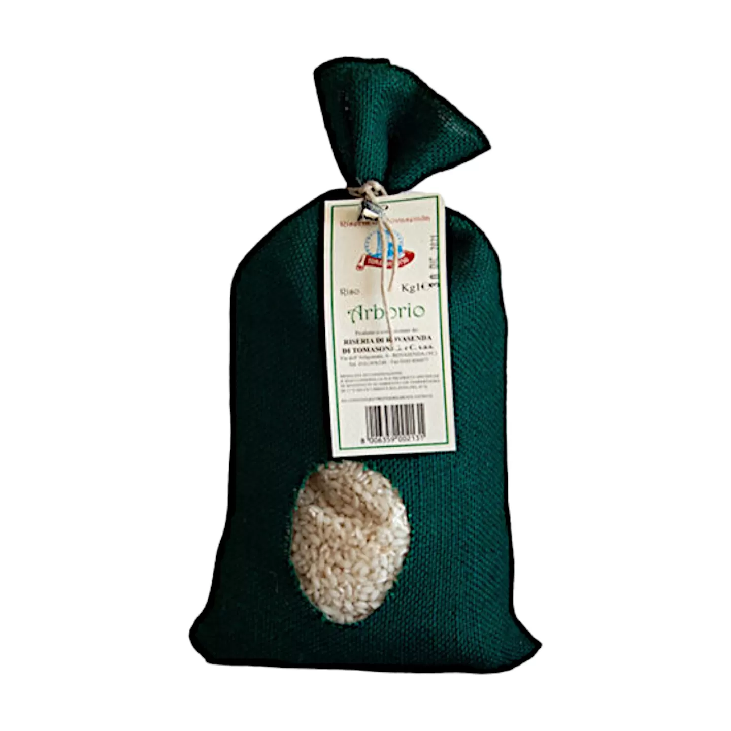 Scopri il riso Arborio della rinomata Riseria Tomasoni di Rovasenda, confezionato con cura in un sacco di juta è famoso per il suo chicco grande e la sua capacità di assorbire liquidi, rendendolo ideale per risotti cremosi.