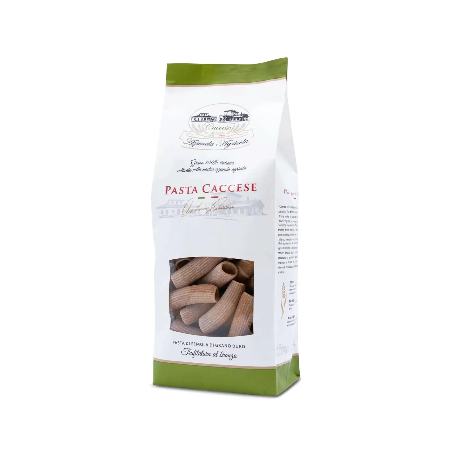 Scopri i Rigatoni Integrali di Pasta Caccese, realizzati con semola integrale di grano duro 100%. Ideali per chi cerca pasta di alta qualità, trafilata al bronzo e priva di residui chimici, perfetti per piatti nutrienti e saporiti.