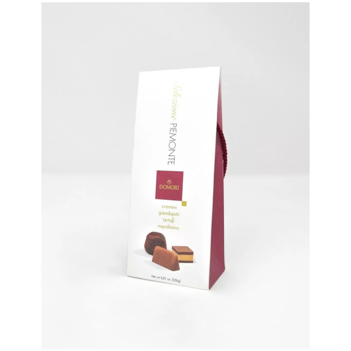 Assortimento di cremini classici, giandujotti classici, tartufi neri e napolitains fondenti, in confezione da 250g.