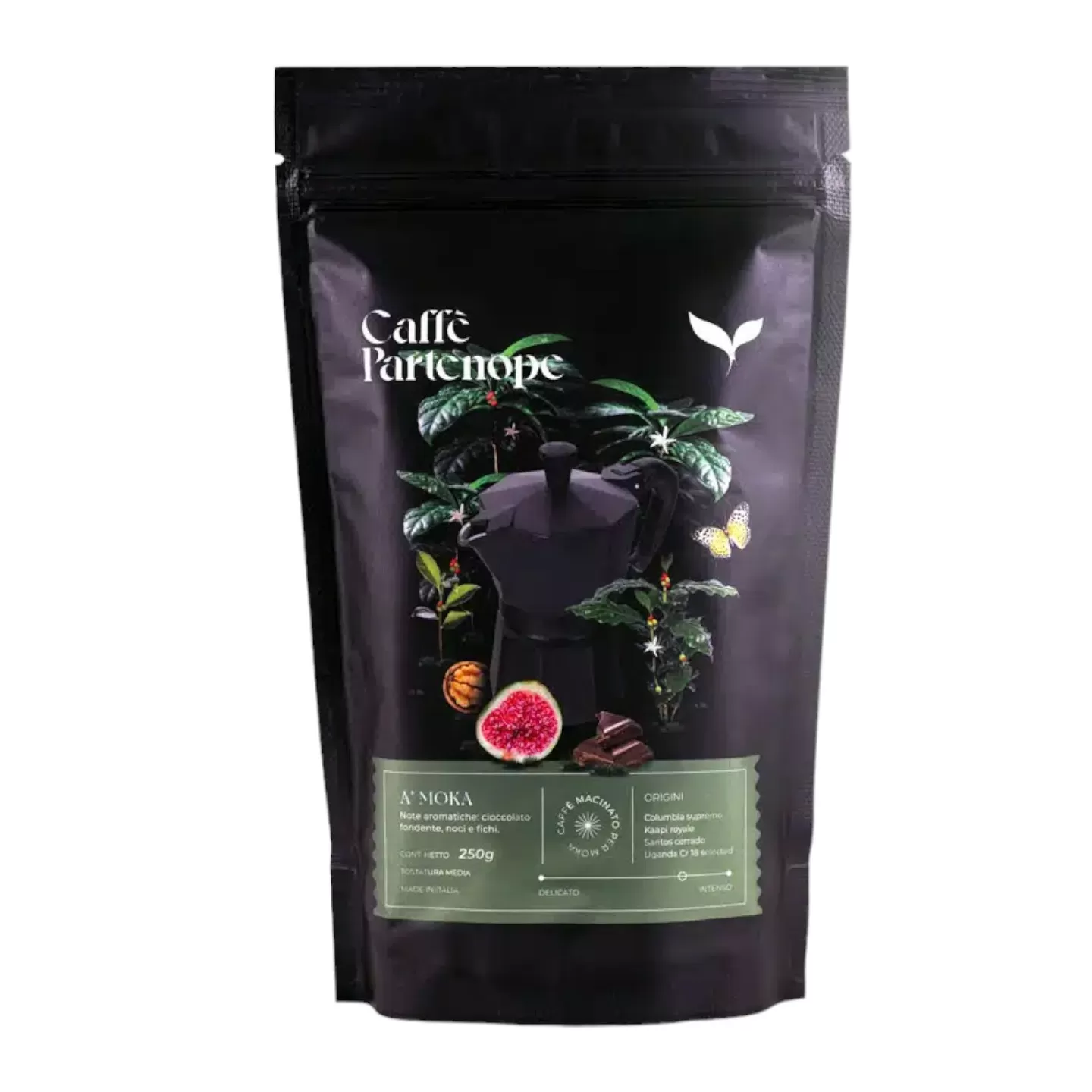 A’ moka – Caffè macinato artigianale per moka o espresso rappresenta la massima espressione della tradizione napoletana, ideata dagli esperti del team Caffè Partenope. Realizzata selezionando i migliori chicchi (origini: Columbia supremo, Kaapi Royale, Santos Cerrado & Uganda Cr 18 Selected), A’Moka è caratterizzata da aromi nitidi e definite note aromatiche di cioccolato fondente, noci e fichi.Ti stupirà la sua corposità rotonda e la sua crema indimenticabile.