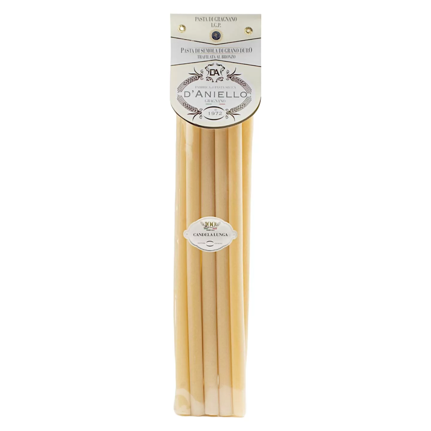Candele lunghe, pasta di Gragnano IGP del pastificio D'Aniello, sono ottenute dall’impasto di semola di grano duro con acqua della falda acquifera locale, caratteristiche specificate anche nel disciplinare I.G.P. PASTA DI GRAGNANO.