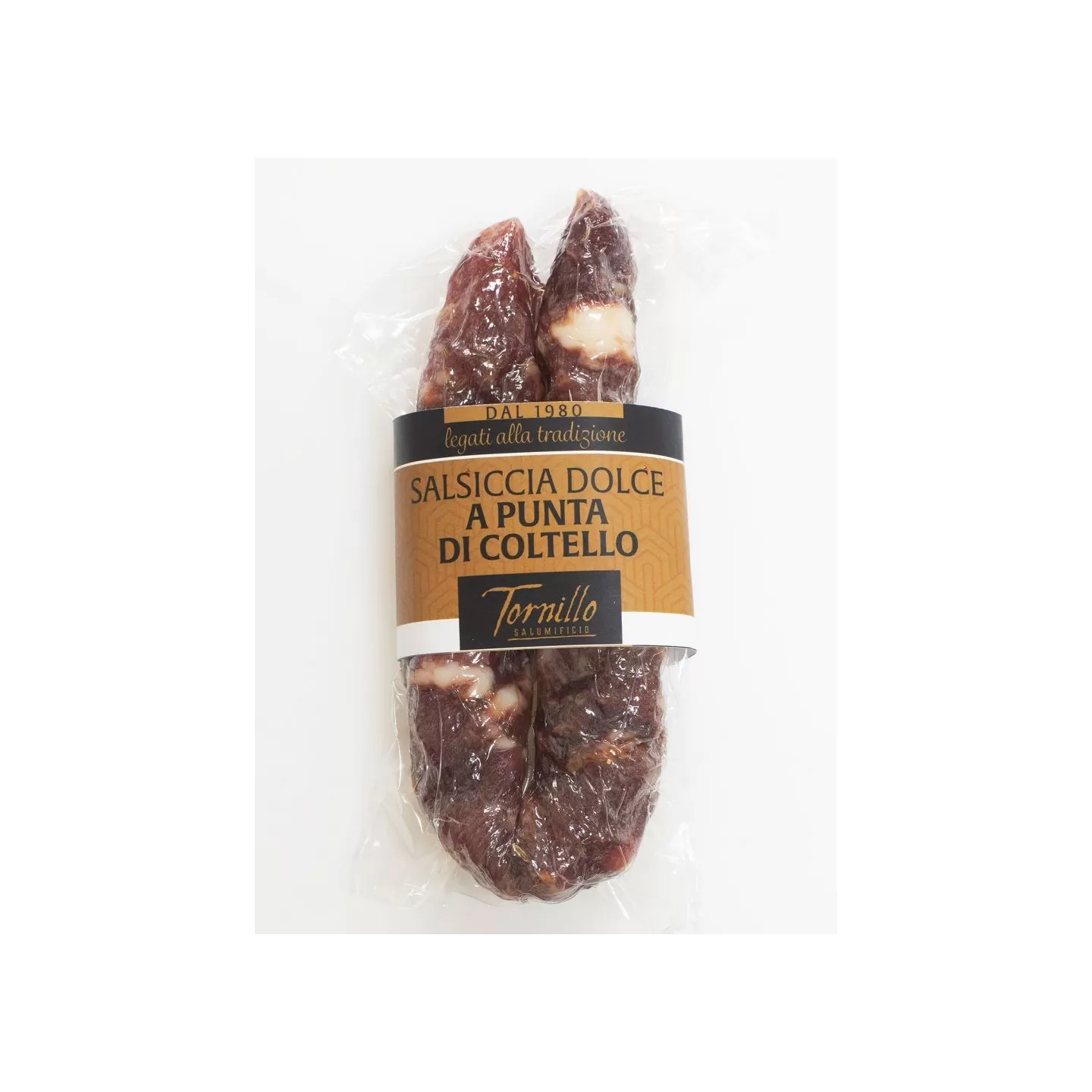 La Salsiccia a punta di coltello del Salumificio Tornillo è prodotta senza conservanti aggiunti, viene lavorata manualmente con carni provenienti esclusivamente da maiali autoctoni, cresciuti con mangimi naturali e non allevati in maniera intensiva.