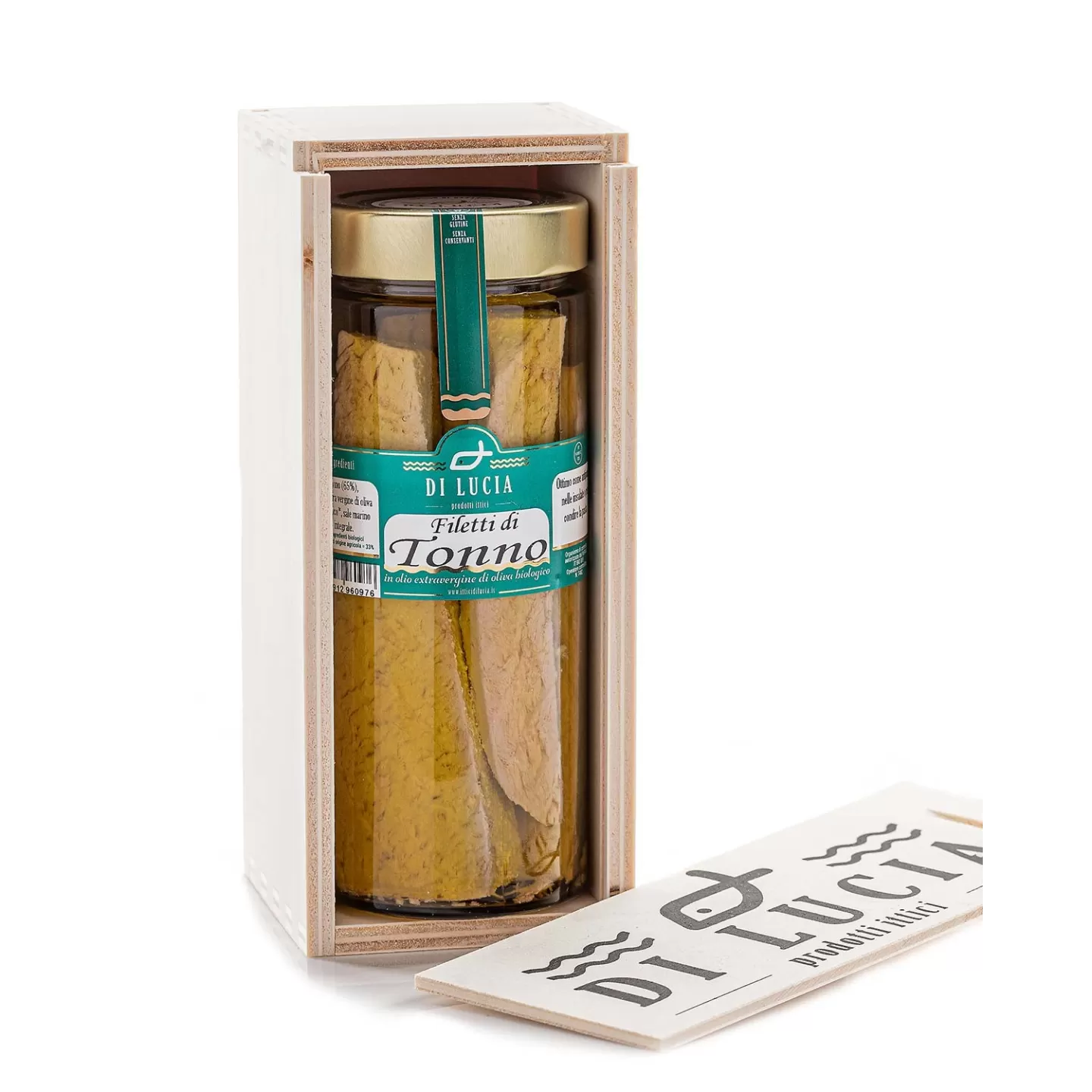 Simpatica idea regalo per amici e parenti, filetti di Tonno in olio extra vergine di oliva biologico 600 g, con confezione regalo CERERE della linea POSEIDONIA, in una elegante cassettina di legno.